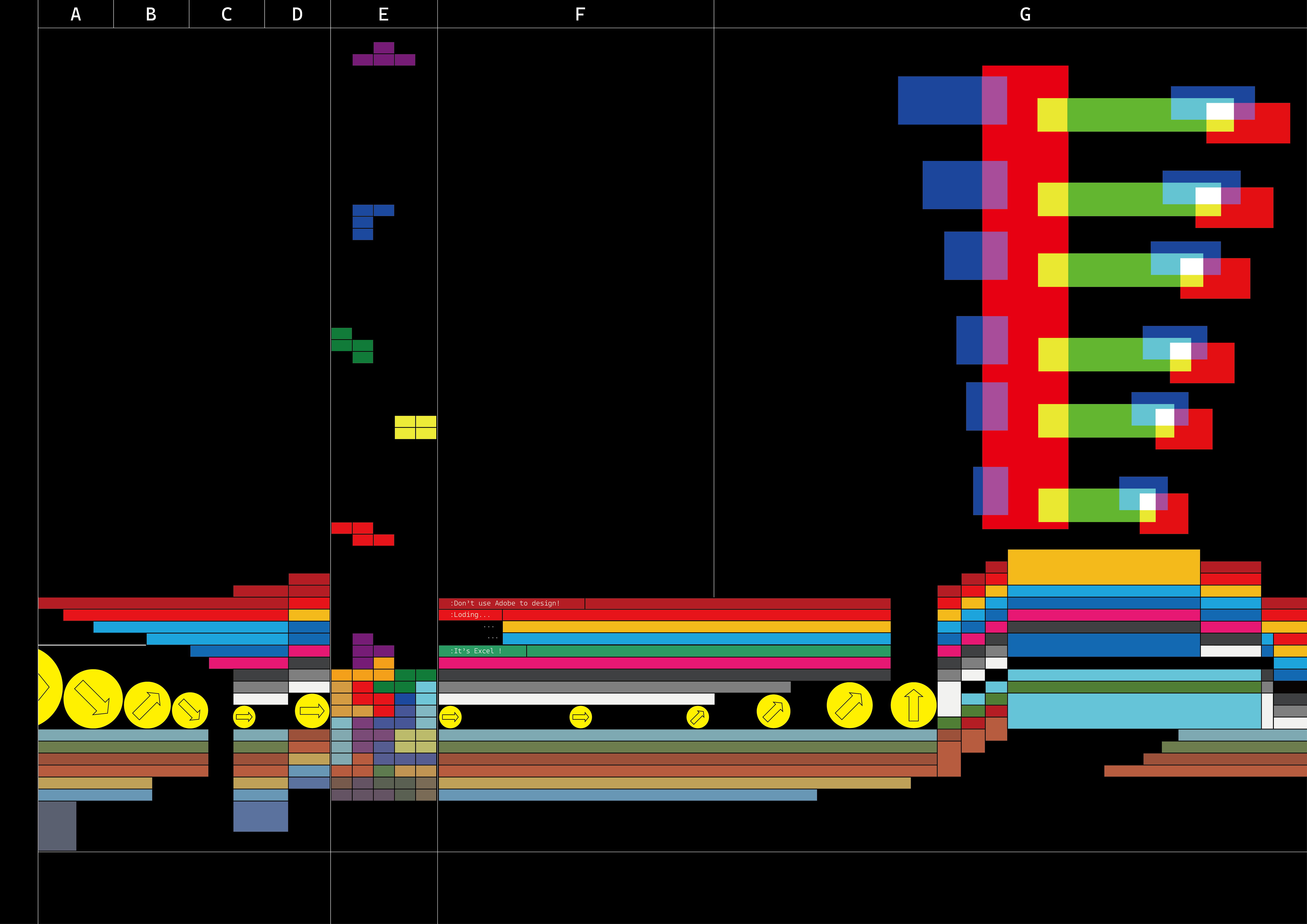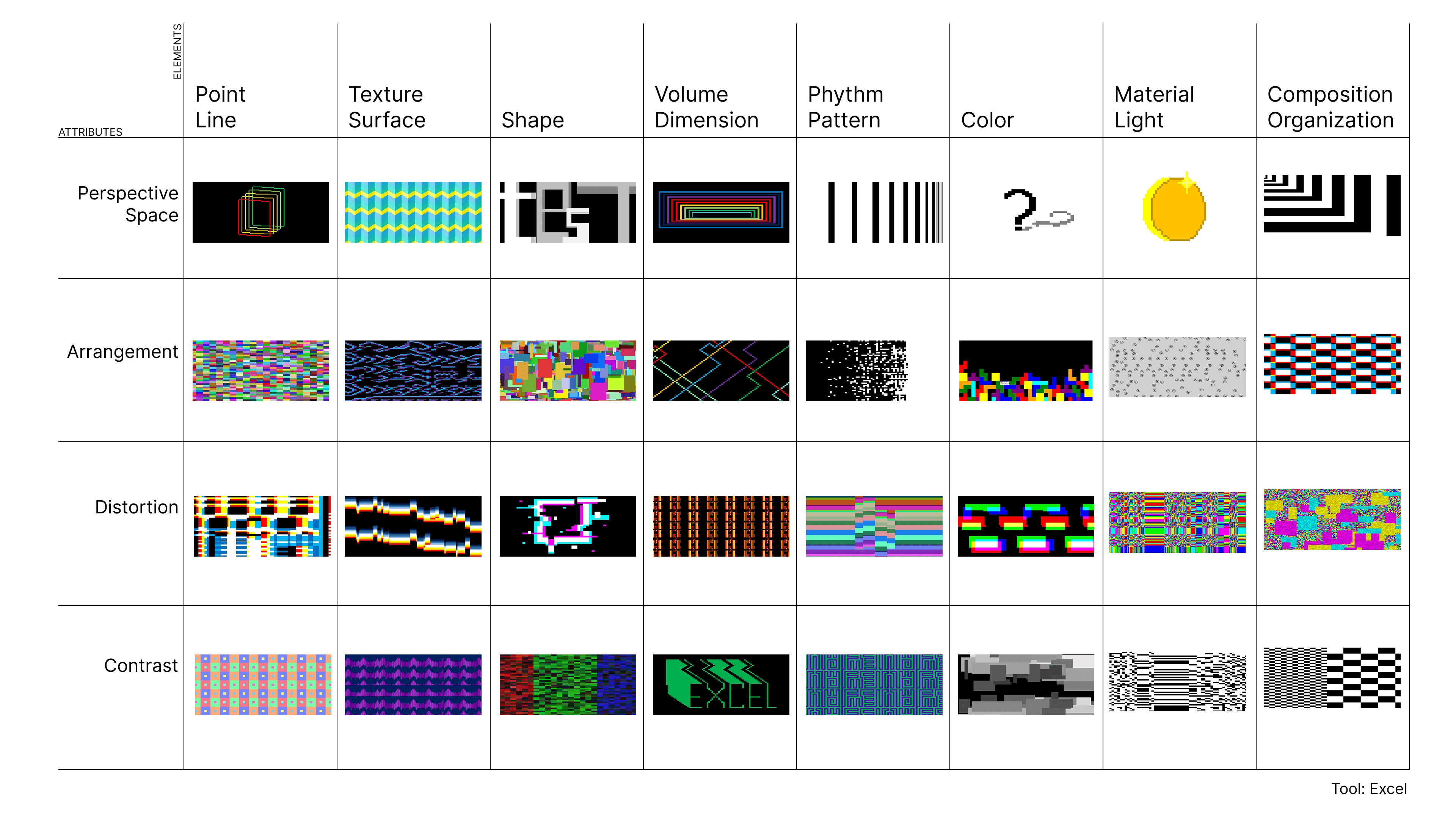 本项目以“非设计工具作为设计媒介”为主题,选择 Excel 表格作为创作工具,探索 Excel 软件在视觉设计潜在可能性。最终创作出 32 张具有不同风格与视觉属性的实验性图像和具有 Excel 特点的海报。